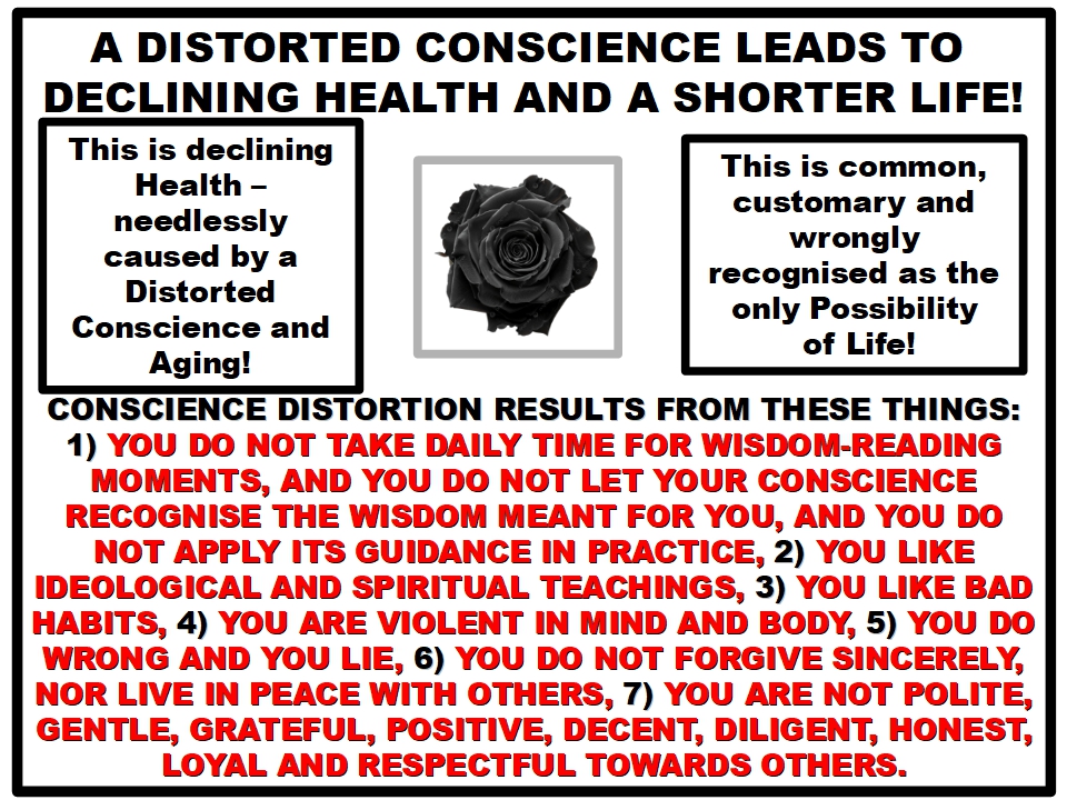 You may think you do not have any distortions in your conscience, but the good side of your conscience will certainly disagree and guide you with inner feelings about which ones need attention. This happens while you are reading these writings, wisdom sayings and watching these pictures. Your conscience has a chance to speak from your heart with inner feelings to let you know that something needs to get better in your attitudes, habits, statements, and behaviour. Let the good side of your conscience guide you for your own benefit.